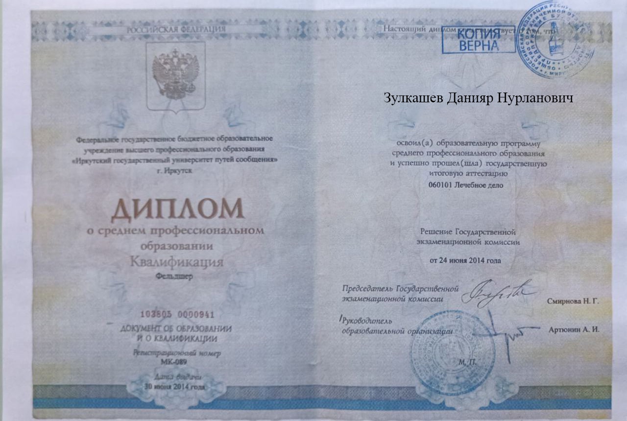 Меня зовут Зулкашев Данияр Нурланович, я — фельдшер выездной наркологической бригады в наркологической клинике "Плюс" в городе Гороховец. Я стремлюсь помогать людям, оказывая квалифицированную медицинскую помощь в самых разных ситуациях, и верю, что каждый пациент заслуживает внимания и поддержки на пути к выздоровлению.